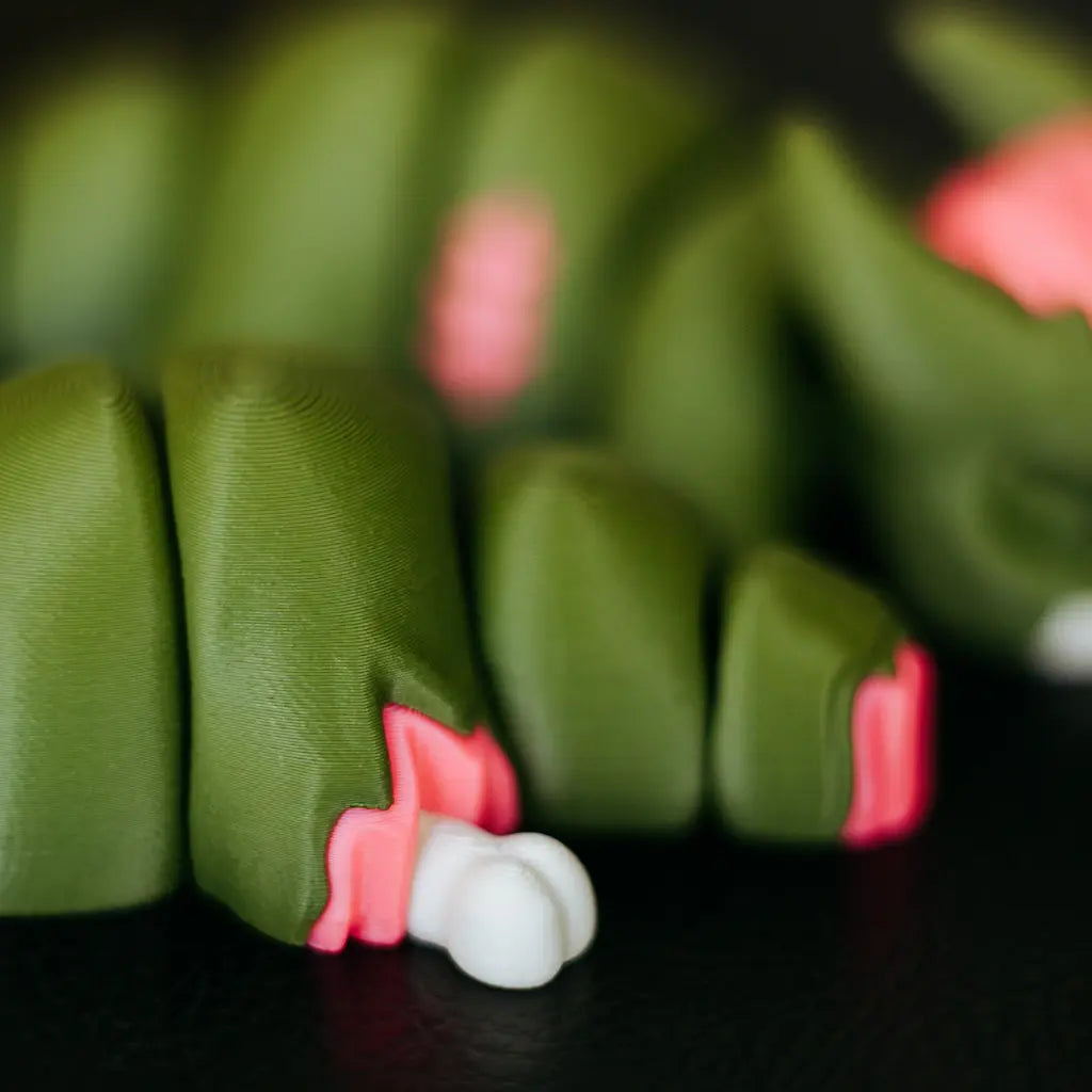 Su cuerpo articulado y segmentado en tonos verdosos transmite la sensación de una criatura que ha vuelto a levantarse tras el colapso. Los detalles rosados repartidos por el cuerpo evocan heridas abiertas, regeneración imperfecta y una energía corrupta que mantiene a Zomble en movimiento.
